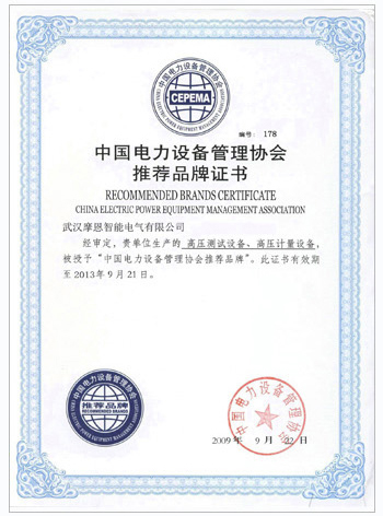 产品名称: 中国电力设备管理协会推荐品牌证书 |