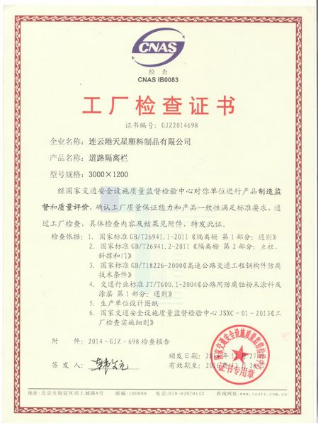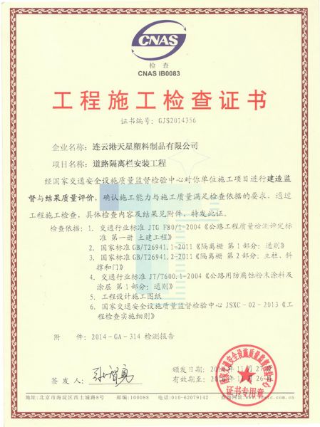 | 持证单位: 天星护栏(连云港天星塑料制品有限公司) |