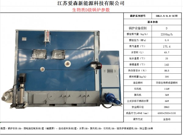 1.SHS2.3-0.8-Q全自动燃气蒸汽锅炉,采用双锅简横置式形式,主要部件有本体受压件、常压节能器,锅炉受压件几何容积为49.6升,辐射及对流受热面采用整体螺旋翅片管,具有结构简单、热效率高、排烟温度低等特点。